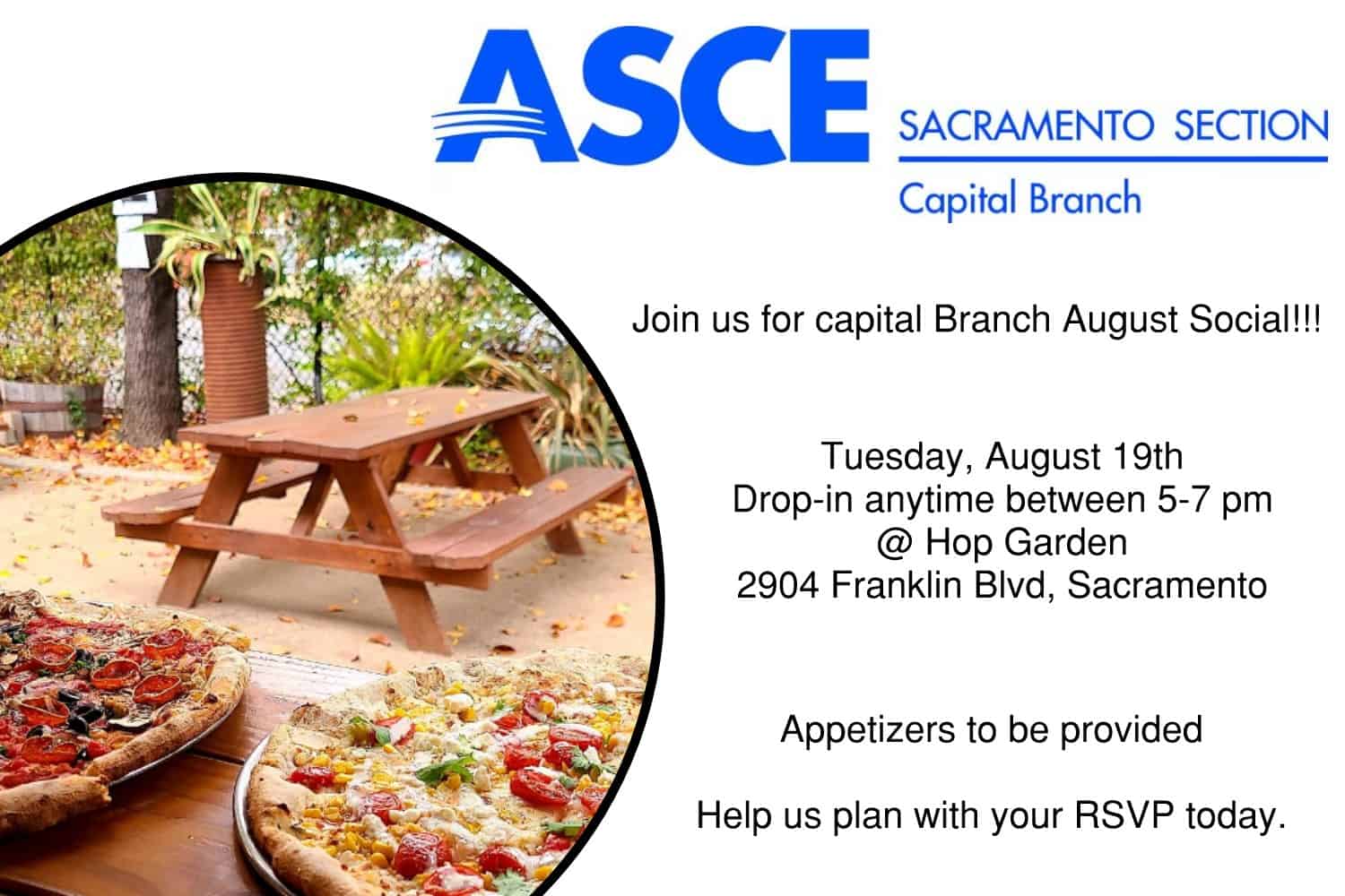 Come out and take a refreshing social break with other hard-working civil engineers at Hop Garden in Sacramento, Tuesday August 19th. Appetizers are on us! Drop in anytime during 5-7pm.
